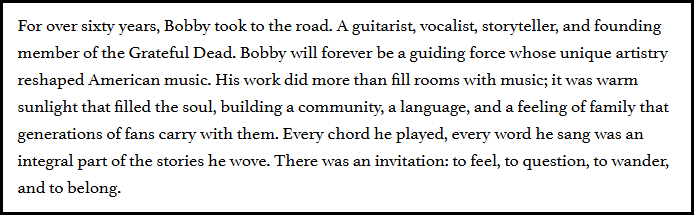 “These songs are … living critters and they’re visitors from another world — another dimension or whatever you want to call it — that come through the artists to visit this world, have a look around, tell their stories. I don’t know exactly how that works, but I do know that it’s real.” – Bob Weir in a 2022 interview with NPR.