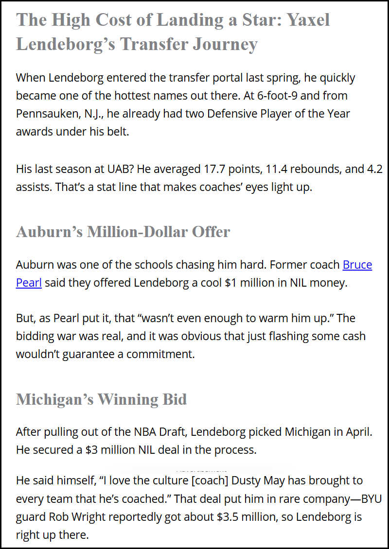Starter Yaxel Lendeborg left UAB after last season, and it was less about Michigan’s “maize and blue” colors and more about good old gold.