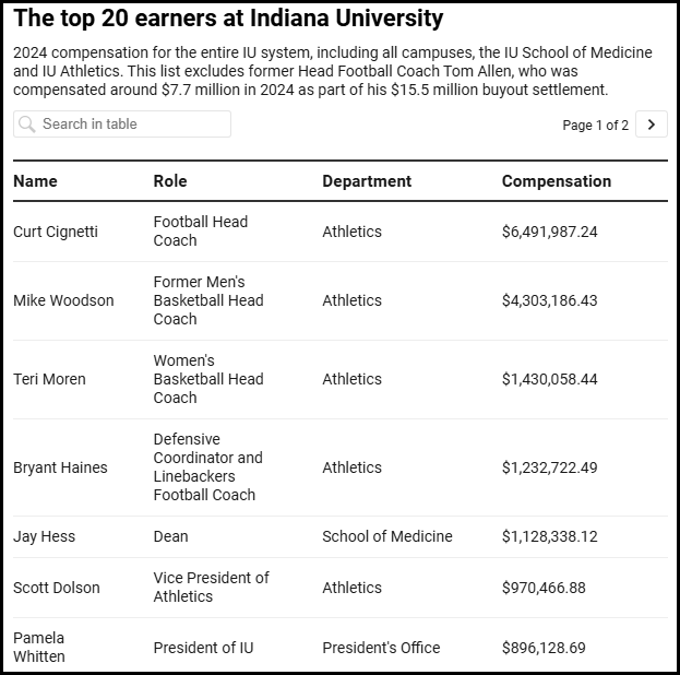 The full list is here. IU head football coach Curt Cignetti makes $6.5 million and typically looks like he’s having about as much fun as a guy who has been stuck in a dentist’s lobby for two hours while awaiting his root canal. Having to coddle 18-year-olds who can jilt you at the end of the year will do that to you.