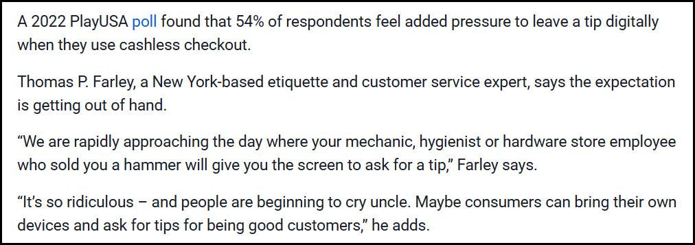 People like to complain about the “choose your tipping amount” message that pops up on the transaction screen at retail establishments, usually at quick-serve restaurants. “Why should I tip them? I did all the work!”