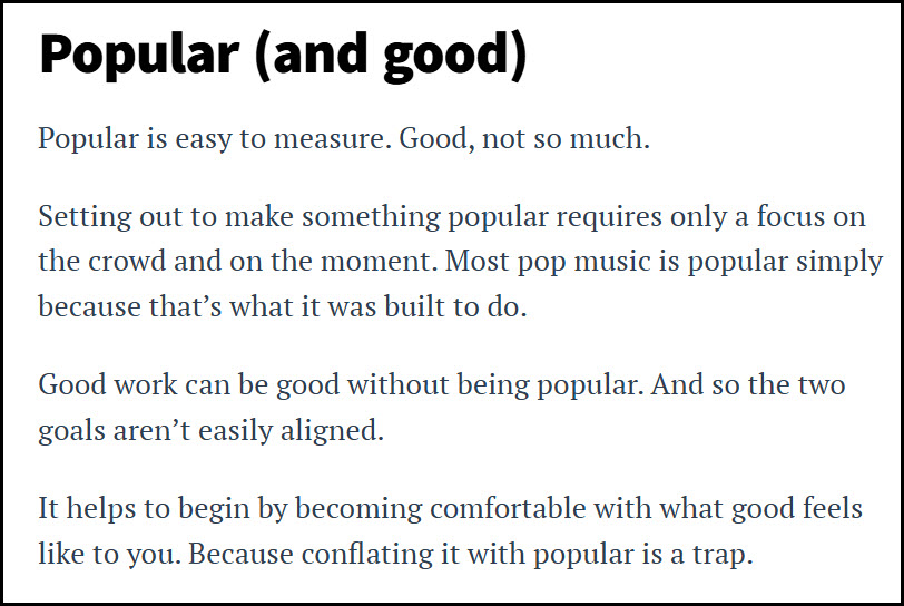 “Good work can be good without being popular.” Amen to that, Brother Seth! In keeping with the music reference that Seth made, I know dozens of bands who have created brilliant music but never got popular. There’s the famous Brian Eno quote about the Velvet Underground: