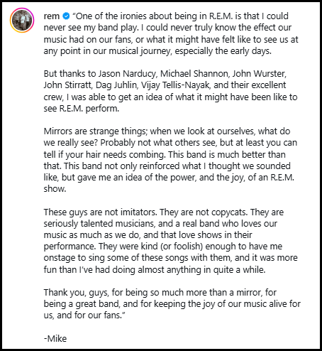 Nostalgia can be a trap. But R.E.M. songs meant a lot to a lot of folks in my age bracket. And a chance to reconnect with those songs — and with one of the guys who created them — was magical. Not just for us, but for Mike Mills too. “The power, and the joy, of an R.E.M. show… keeping the joy of our music alive for us, and for our fans.”