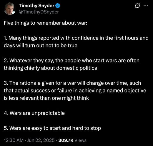 I read your post Damian and I like it very much. As we move from a Saturday morning headline of U.S. Attacks Iran to just this morning we become aware of the complete morass we’re in, and again, as you wisely point out. The why we’re bombing Iran is not very clear. Some justification but most importantly not a determined objective. We are wandering again. DJ and company run on bravado, ignorance, lies, half truths and bruised ego’s. We live the mess.